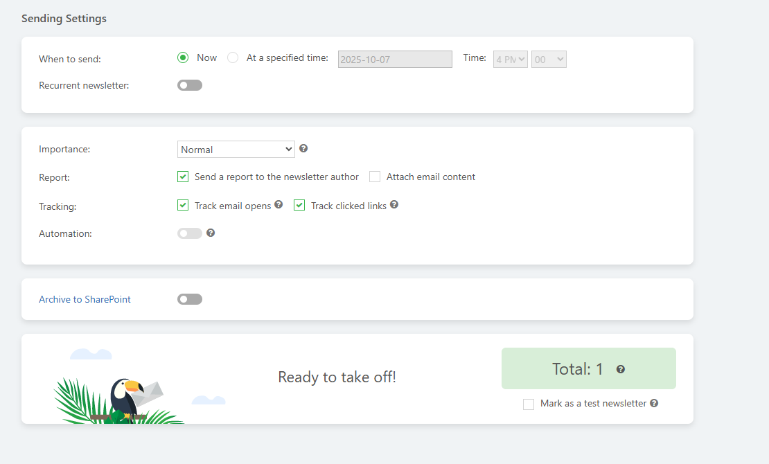 - When to send: specify whether the newsletter should be sent immediately or at a specified date and time in the future.