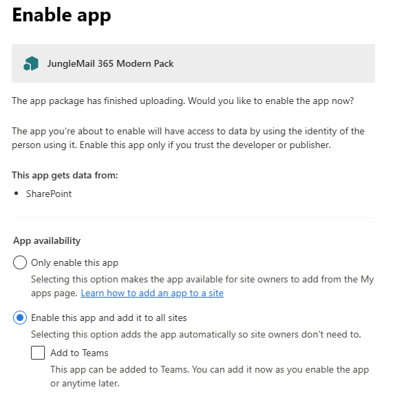 1. Add JungleMail 365 Modern Pack to your tenant or site collection.