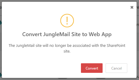 Convert the site via the pop-up window. The site will be converted to a standalone site and will no longer be accessible via the SharePoint app. If people were accessing JungleMail directly via the SharePoint app, please add the appropriate JungleMail URL's as bookmarks or buttons/quick links in SharePoint as an alternative.