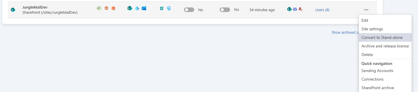 This step can be skipped if your JungleMail sites are not linked with SharePoint and already standalone JungleMail sites. You can identify such sites by the purple cloud logo next to their name, while SharePoint-associated sites have the green SharePoint logo.